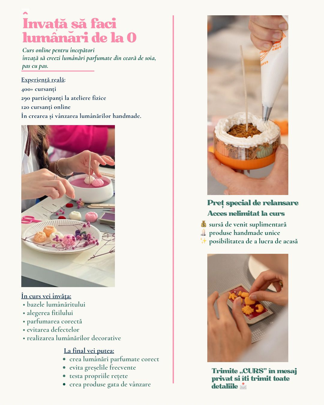 Cursul de lumanari este un curs online inregistrat ca fiecare sa invete in ritmul ei si cand are timp disponibil.